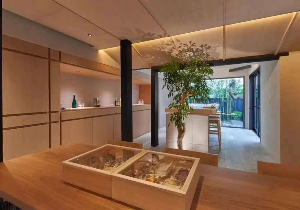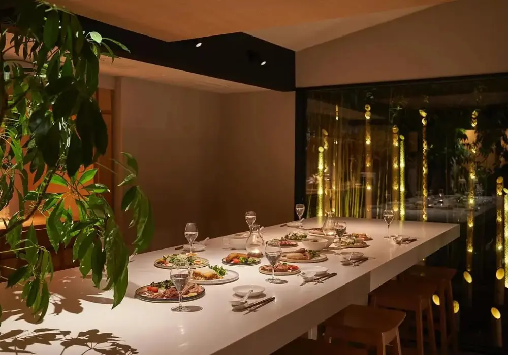 料理の香りとともに、心地よい照明が空間全体を包み込み、静寂で落ち着いた雰囲気を作り出しています。