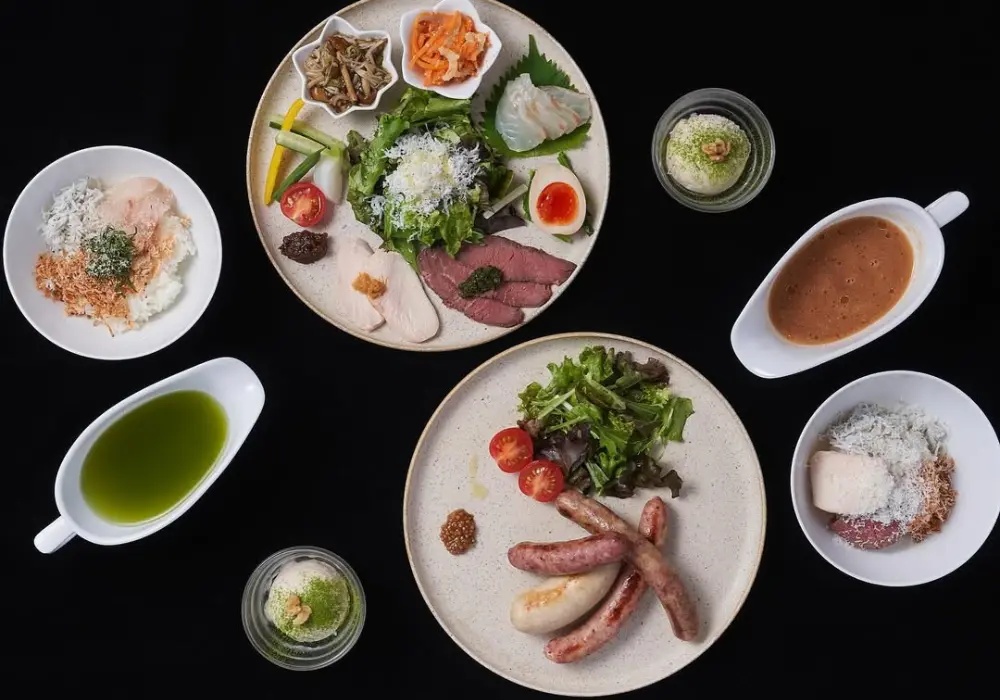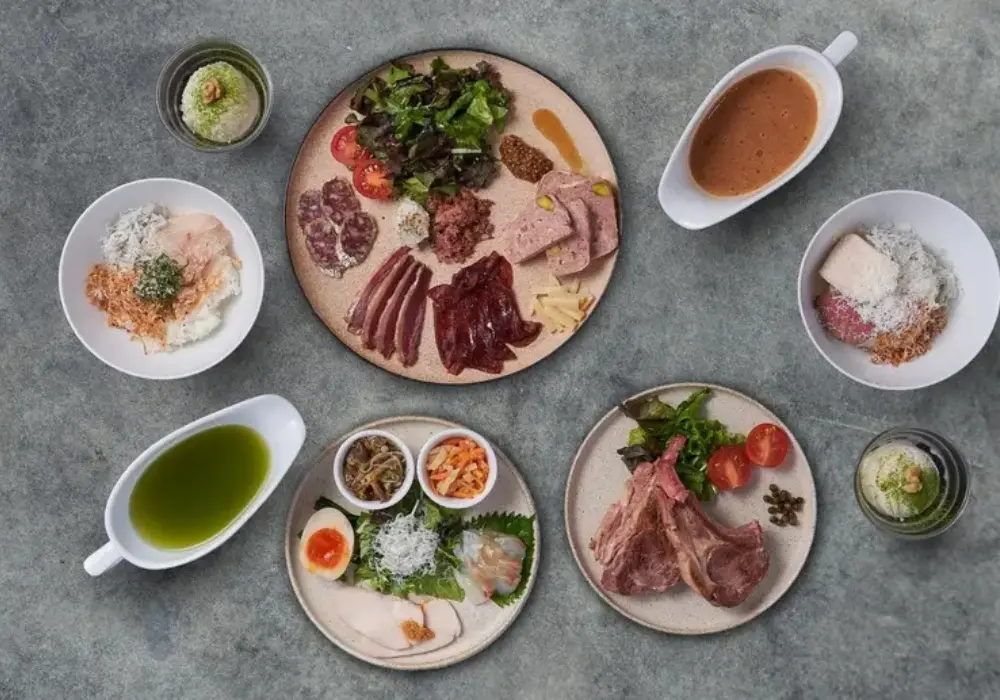 前菜から「だしボウル」国産熟成肉の盛り合わせソーセージとラムチョップのメイン料理まで堪能できる充実のコース。