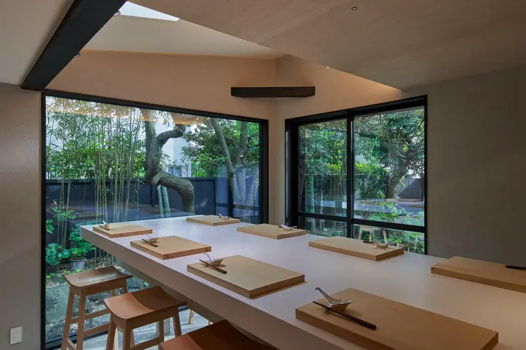 築100年の古民家を改装し、梁や障子、天然木材などモダンな中にも日本らしさを感じられる店内。自然光が差し込み、店を囲む美しい庭園を望めます。