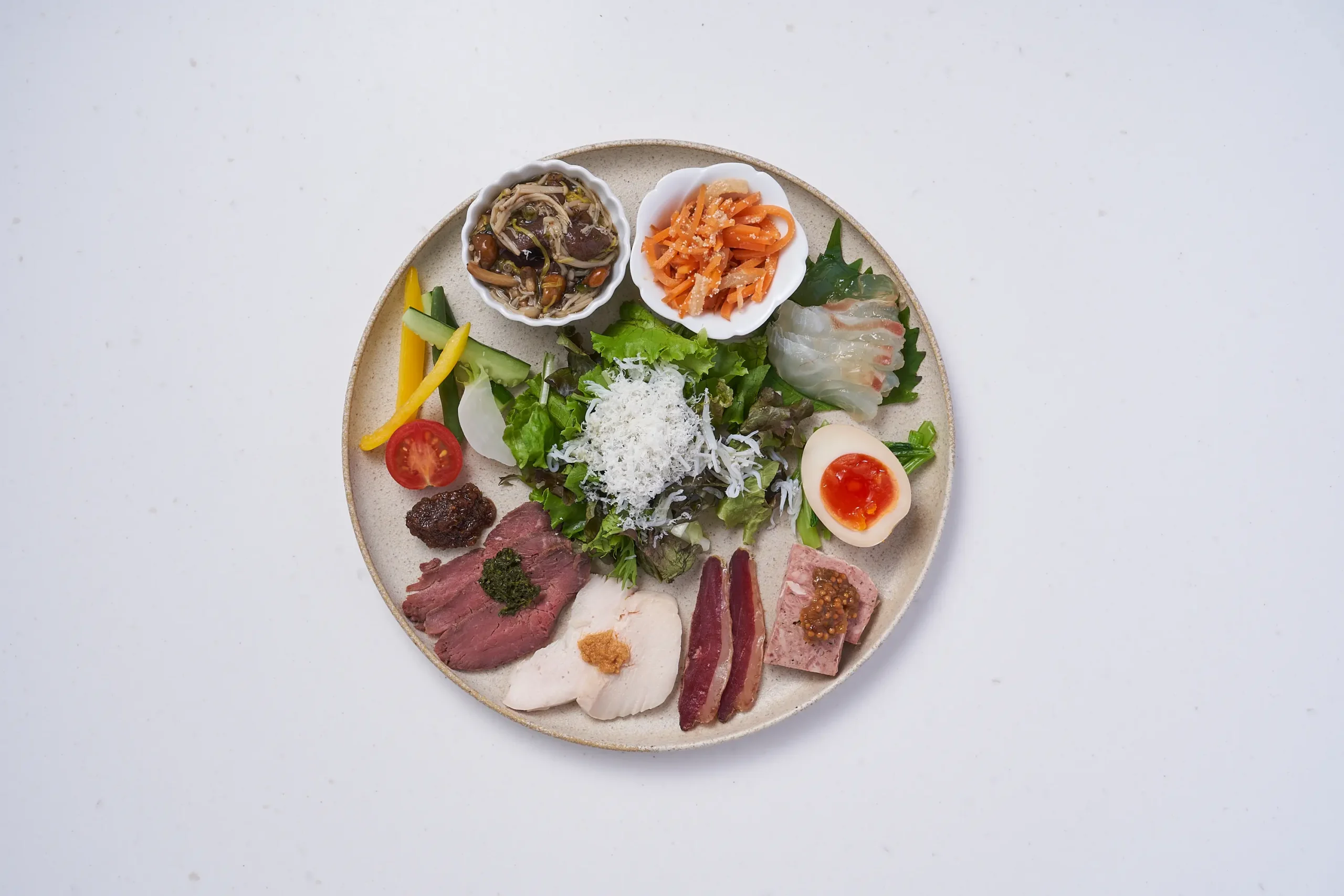 内容:ローストビーフと玉露のソース、しっとり鶏ハム、4種のきのことがごめ昆布の旨み漬け、人参とタラコの和え物、鯛の昆布締め、生野菜スティックとパドロン味噌、湘南しらすとチーズのサラダ、自家製やみつき煮卵ななど、季節によって内容変更があります。
